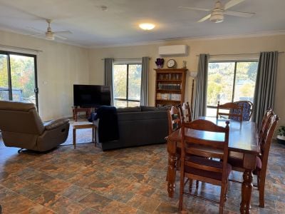Nestled in mature native garden we have this 3 bedroom home with deep front verandah - comprising formal lounge with cosy wood heater - perfect for the winter weather. Built in robes all bedrooms and central family bathroom. Spacious country style kitchen adjoining meals area plus separate large family living / dining area with access to large entertaining deck overlooking garden with abundance of King Parrots & Black Cockatoos.