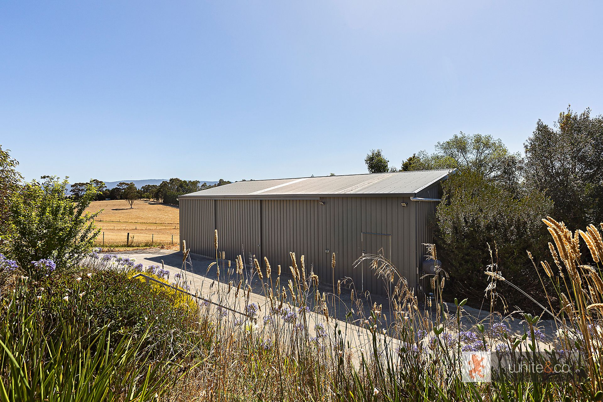 Expansive colorbond shed 19m x 11m approx. with power, concrete floor, mezzanine storage and convenient extra toilet.